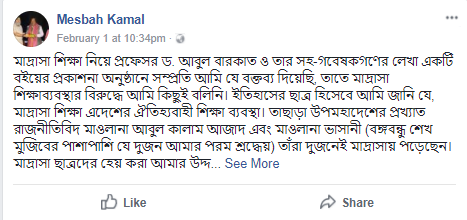 দুঃখ প্রকাশ করে দেয়া ফেসবুক স্টেটাস-এ ইতিহাসের ওই অধ্যাপক বলেন, ‘ইতিহাসের ছাত্র হিসেবে আমি জানি যে, মাদ্রাসা শিক্ষা ব্যবস্থা এ দেশের ঐতিহ্যবাহী শিক্ষা ব্যবস্থা। তাছাড়া উপমহাদেশের প্রখ্যাত রাজনীতিবিদ মাওলানা আবুল কালাম আজাদ ও মওলানা ভাসানী (বঙ্গবন্ধু শেখ মুজিবের পাশাপাশি যে দু’জন আমার পরম শ্রদ্ধেয়) তাঁরা দু’জনেই মাদ্রাসায় পড়েছেন।” এখানে মাওলানা আজাদের মাদ্রাসায় পড়ার তথ্যটি ভুল। মওলানা ভাসানী মাদ্রাসায় পড়লেও আজাদ কখনো মাদ্রাসায় পড়েছেন বলে জানা যায়নি। তিনি কোনো প্রাতিষ্ঠানিক শিক্ষাই নেননি। পারিবারিক শিক্ষা ও নিজের চর্চার মধ্য দিয়েই বেড়ে ওঠেন। যিনি ১৯০০ সালে মাত্র ১২ বছর বয়সেই একটি পত্রিকার সম্পাদনা শুরু করেন তার প্রাতিষ্ঠানিক শিক্ষার দরকারও পড়ে না। দুঃখজনকই বটে, ইতিহাসের অধ্যাপক হয়েও নিজের পরম শ্রদ্ধেয় তিনজনের একজনের জীবন নিয়ে ভুল তথ্য দেন।