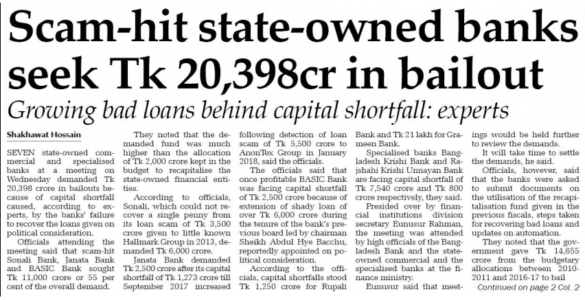 এটা আসলে আগেই ওঠা উচিত ছিল। কারণ ২০১০-১১ থেকে রাষ্ট্রায়ত্ব ব্যাংকগুলো প্রায় ১৫ হাজার কোটি টাকা বেইল আউট পেয়েছে। (নিউ এইজ, ১৫ ফে.)। কিন্তু তাতে পরিস্থিতির কোন উন্নতি হয়নি। সাতটি রাষ্ট্র নিয়ন্ত্রিত বাণিজ্যিক ও বিশেষায়িত ব্যাংক সম্প্রতি সরকারের কাছে আবারও মূলধন সংকট সামাল দিতে ২০ হাজার ৩৯৮ কোটি টাকা সমমানের বেইল আউট চেয়েছে। যেমন, সোনালি ব্যাংক ২০১৩ সালে কেবল একটি প্রতিষ্ঠানকে দিয়েছে সাড়ে তিন হাজার কোটি টাকা যার কিছুই উদ্ধার হয়নি। এখন তারা সরকারকে বলছে ৬ হাজার কোটি টাকা তাদের দিতে হবে। একইভাবে রাষ্ট্রীয় সহায়তা চাইছে দুর্নীতির জন্য প্রচার মাধ্যমে বারংবার নাম উঠে আসা বেসিক ব্যাংক, জনতা ব্যাংক ইত্যাদি প্রতিষ্ঠানও। কিন্তু কেন এই বেইল আউট হতেই হবে সে নিয়ে সমাজে কোন আলাপ-আলোচনা-বিতর্ক নাই।