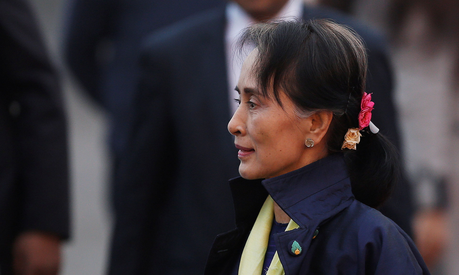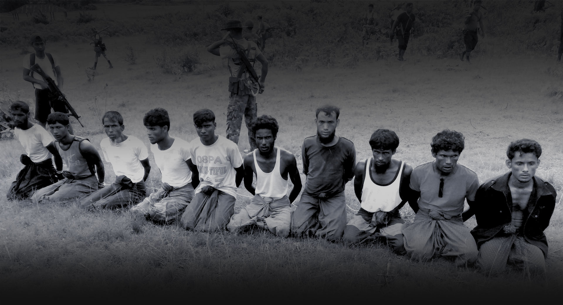ওই দু’জনের একজন অং মিন যিনি ইয়াঙ্গুন থেকে এখানে এসেছেন। আটককৃতদের একদম পেছনে দাঁড়িয়ে আছেন। তিনি অস্ত্র হাতে ক্যামেরার দিকে তাকিয়ে আছেন। আরেকজন পুলিশ ক্যাপ্টেন মো ইয়ান ন্যাং একেবারে বাম দিকের জন। তিনি কাঁধে অস্ত্র হাতে হাঁটছেন।
