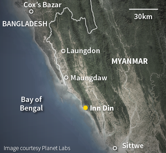 - রাখাইনের রাজধানী সিত্তয়ে-র গোয়েন্দা সংস্থায় কাজ করা তিন আধা সামরিক পুলিশ কর্মকর্তা বলেন, সেনা কমান্ড চেইন থেকে ইন দিনের রোহিঙ্গা গ্রামগুলো ‘পরিষ্কার বা নিশ্চিহ্ন’ করার আদেশ দেয়া হয়েছে। এক আধা সামরিক পুলিশ কর্মকর্তা জানান, নিরাপত্তা বাহিনীর সদস্যরা অভিযানের সময় শনাক্তকরণ এড়ানোর জন্য অসামরিক পোশাক পরতো।